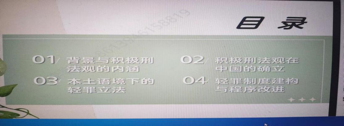 讲座主要围绕以下几个问题展开:第一,背景和积极刑法观的内涵;第二,积极刑法观的确立;第三,本土语境下的轻罪立法;第四,轻罪制度构建与程序改进。