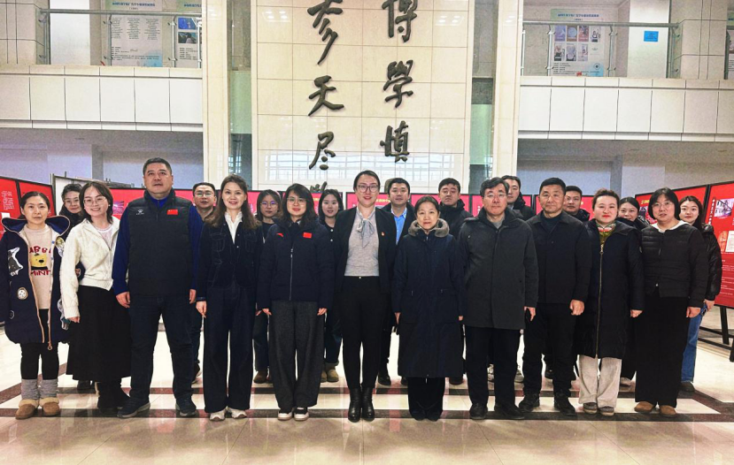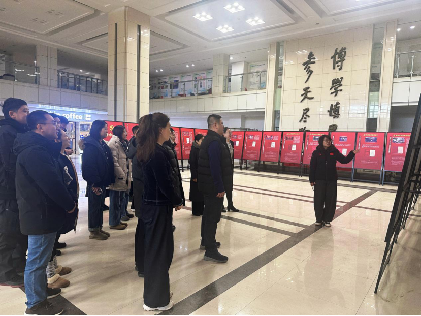 党委书记孙世萍、党委副书记董捷、学院纪检委员以及教师党员在汇文楼一楼大厅参观学习“党章中的纪律”专题展览。