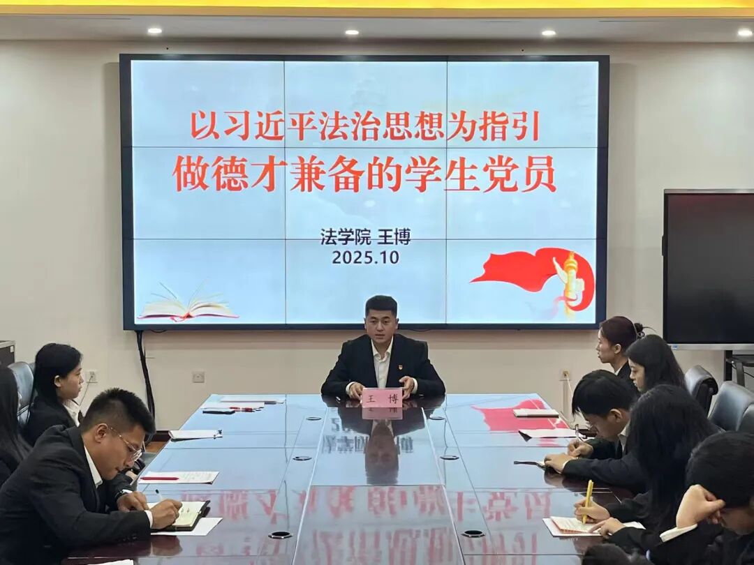 团委副书记王博老师以“以习近平法治思想为指引,做德才兼备的学生党员”为题,讲解习近平法治思想的历史发展与重要意义,并结合自身学习和工作经历,阐释“爱国、励志、求真、力行”的丰富内涵。鼓励同学们深刻领悟《习近平与大学生朋友们》,不断强信念、学知识、练本领、担责任。