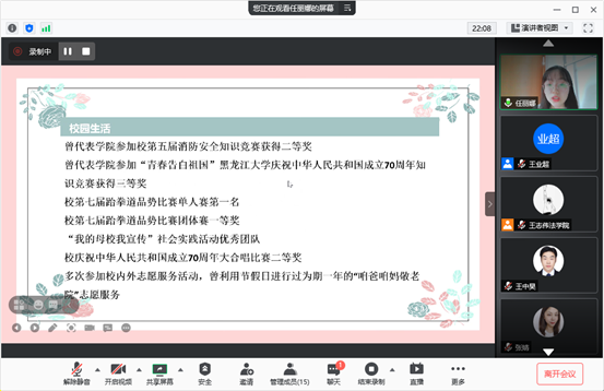 11名候选人依次进行答辩,答辩过程中各位同学分别从学习成绩、科研经历、社会实践、志愿服务等方面进行陈述,以真诚的态度为自己大学四年的收获做总结。