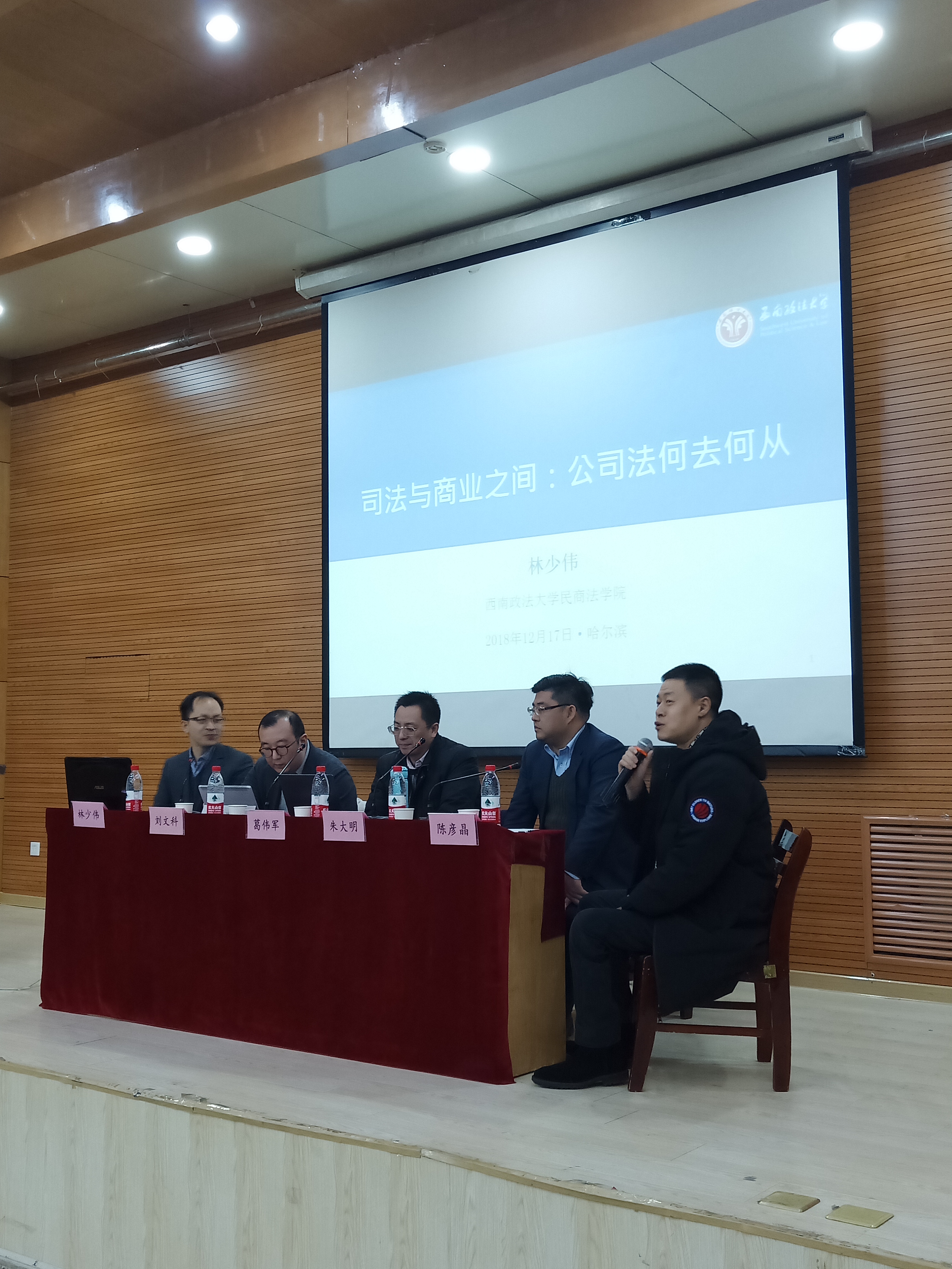 首先,林少伟教授以其生动的语言向同学们介绍了自己的观点,并通过ppt从理论背景、规则、研究和实践四个方面详细讲述了中国公司法的基本进程。同时,林教授论述了公司法何去何从的论题,并从“政府与商业之间”、“为何以服为标准”、“如何服”方面展开论述。