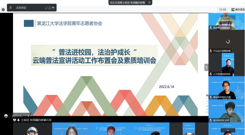 青年志愿者协会主席张国巍对本次云端普法理论宣讲活动的总体工作安排进行了布置,指出将于6月18日和26日分别对向哈尔滨宝清三中和五常市第三中学、五常市雅臣中学开展两场宣讲活动,并说明宣讲对象的基本情况,号召宣讲队伍成员做好充足准备,以高度热情参加到宣讲活动中去。