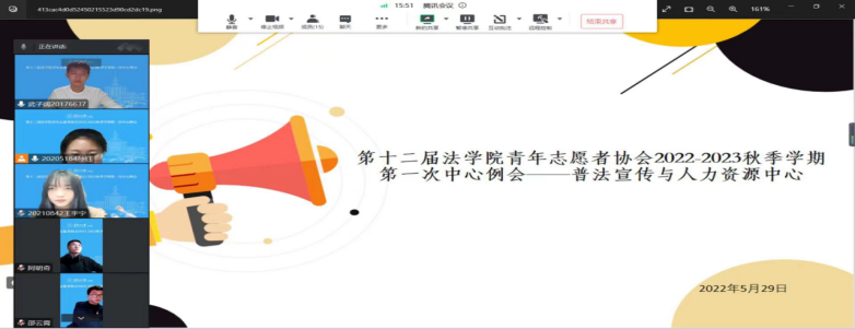 青年志愿者协会开展了2022-2023春季学期第一次中心例会。此次例会在腾讯会议开展,在主席张国巍做了会议开始的发言后,各中心进入各自腾讯会议室开展各中心会议。