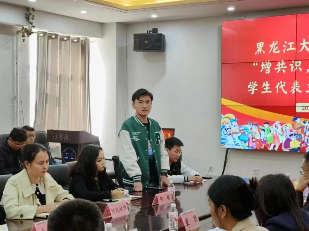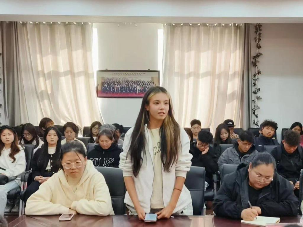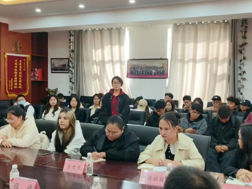 党委副书记董捷,学生工作部(学生处、武装部)少数民族专职辅导员阿孜姑丽、阿胡,内派教师古力旦,学院各年级辅导员,以及22个民族近80名学生参会,会议由2023级辅导员王志伟主持。