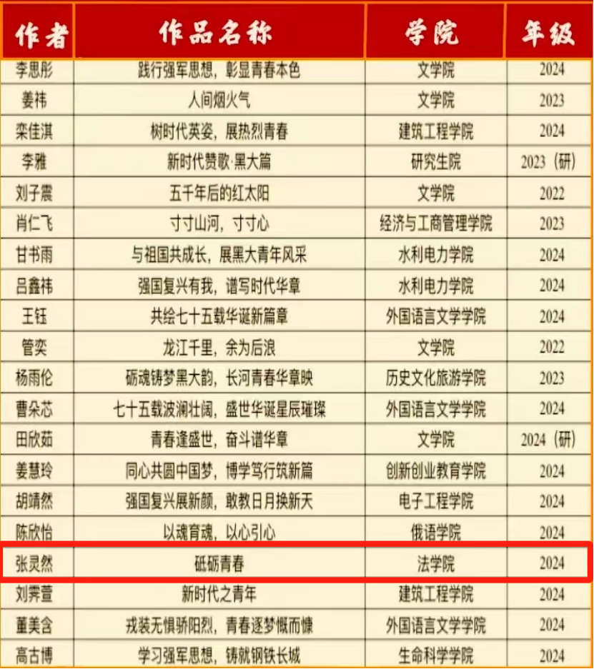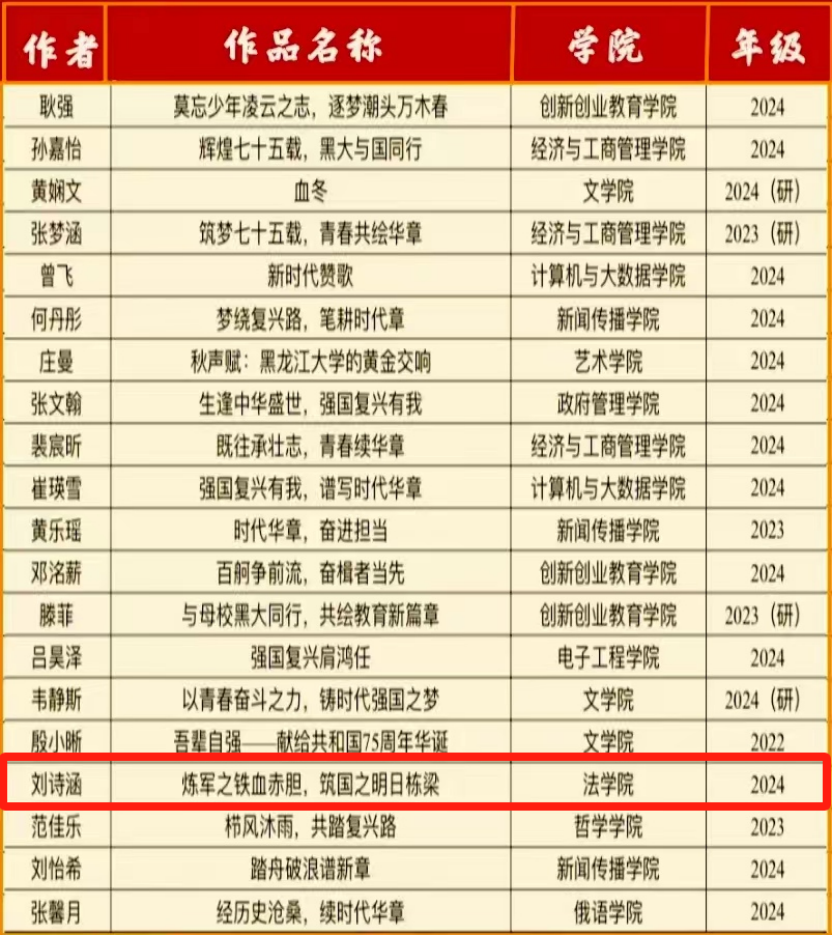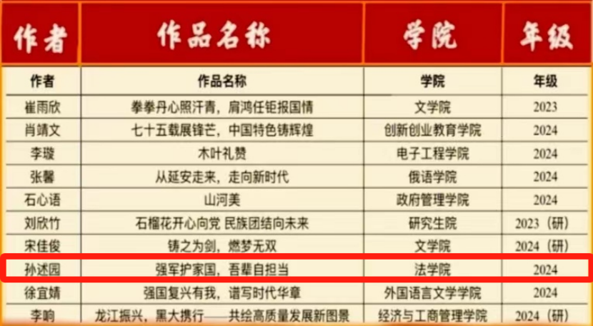 积极组织学生参加“强国复兴有我 谱写时代华章”庆祝中华人民共和国成立75周年主题征文比赛。法学学子以笔为犁,深厚的人文底蕴和炽热的爱国情怀跃然纸上,总计5篇作品在全校23个学院共作品1300余篇中脱颖而出,其中,孙述园一篇获得一等奖,刘诗涵一篇获得二等奖,曲珈莹、宫豪骏各一篇获得三等奖,张灵然一篇获得优秀奖。祝贺获奖同学,希望未来耽美漫画