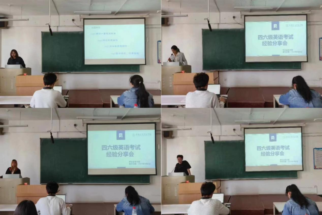 学生会组织开展四六级经验分享会,有效建立了“整合-共享”的学术互助平台,依靠线下分享会,优秀学生代表以自身备考经历为基础,深入剖析四六级考试中听力、阅读、写作、翻译四种关键题型,详细讲解每种题型的技巧步骤以及解题思路,特别强调了平时积累和练习的重要性,提醒广大同学要在日常学习中不断积累知识,提高解题能力。使同学们对考试流程有了更为清晰的认识,有利于备考同学保持良好的心态,自信迎接挑战。