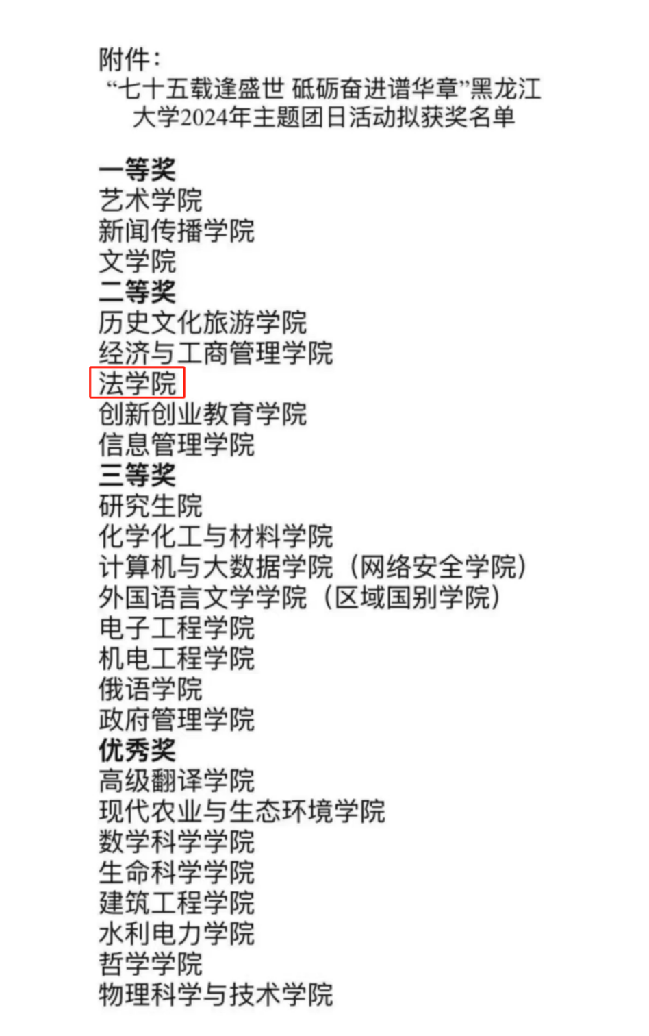 本次团日活动顺利展演了来自2024级联合团支部的十个精品节目。通过互动歌舞,大合唱,小合唱,朗诵,情景剧等丰富多元的形式,带领在场师生一同再忆红色光辉,赓续红色血脉;歌颂大美中华,展现文化自信;弘扬宪法精神,维护宪法权威;唱响龙江精神,凝聚奋进力量。