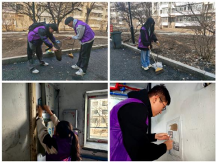 午后,志愿者们身着紫色马甲齐聚家属区,分工明确,团结互助,沿着道路边缘,细心地检查着每一个角落,一一拾起零落的垃圾,投入纸箱中;细致清理楼道的小广告,维持楼道整洁,这些行动也使家属区的居民感到温暖与关怀。拾起的每一个垃圾、清理的每一份广告,都是清明新风的先行引领,都是对青春奉献和志愿担当的诠释。