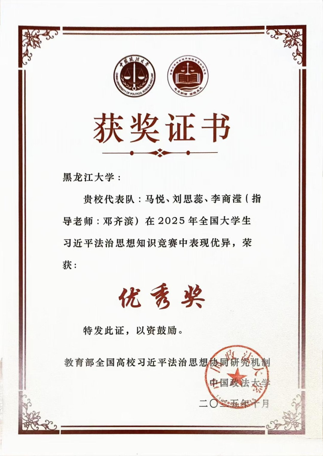 高度重视、全面指导、大力支持,选派2022级本科生刘思蕊、2023级本科生李商滢、2024级本科生马悦三名同学组成代表队。指导教师邓齐滨带领参赛学生系统梳理《习近平法治思想学习纲要》《习近平法治思想概论》等书目,进行多轮知识辅导与模拟训练,参赛学生认真复习、沉着应对,展现出扎实的理论功底和良好的综合素养,在初赛选拔中荣获优秀奖。