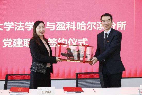 与北京市盈科(哈尔滨)律师事务所在中实大厦10层多功能会议室举办党建联建暨教学实践基地揭牌仪式,院党委书记胡东、院长哈书菊,党委副书记、副院长魏双、副院长丁玉翠、团委书记王业超、盈科哈尔滨党支部书记赵明、执行主任徐强、监事会主任潘立波及相关人员共同出席了此次签约揭牌仪式,仪式由盈科哈尔滨执行主任助理苏瑞雪主持。