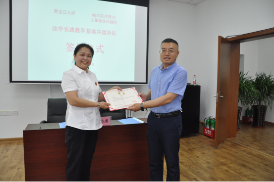 与哈尔滨市劳动人事争议仲裁院共建法学实践教学基地签约揭牌仪式在哈尔滨市劳动人事争议仲裁院成功举办。我校副校长严明、哈尔滨市劳动人事争议仲裁院院长孟朝晖、耽美漫画