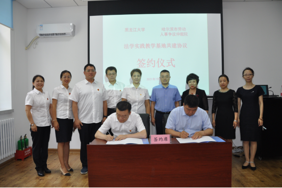 副院长丁玉翠、劳动与社会保障法研究中心主任王佳慧、哈尔滨市劳动人事争议仲裁院立案审监庭庭长王际岩、劳动关系庭庭长韩伟明、副调研员周广文、仲裁员程泽铭等出席签约仪式。会议由哈尔滨市劳动人事争议仲裁院副院长于冬梅主持。