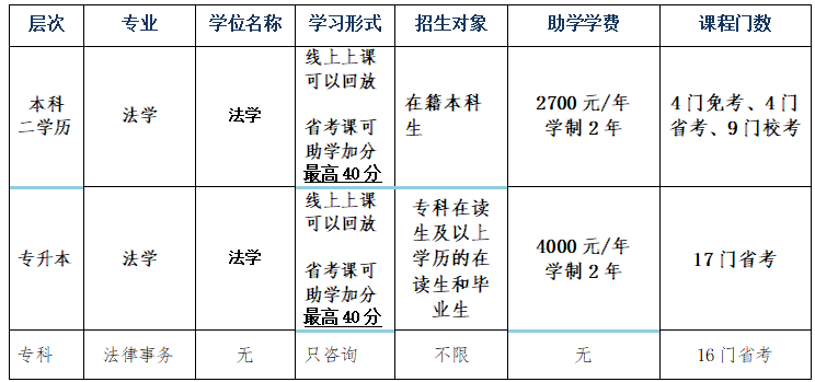 (2)省考专业课(共13门)全省统考课程:侵权责任法、环境资源法学、劳动和社会保障法、律师与公证制度、国际法、国际经济法、合同法、公司法、知识产权法、犯罪学、法律文书写作、行政法与行政诉讼法、中国法律思想史。学位专业课程:合同法、劳动和社会保障法。