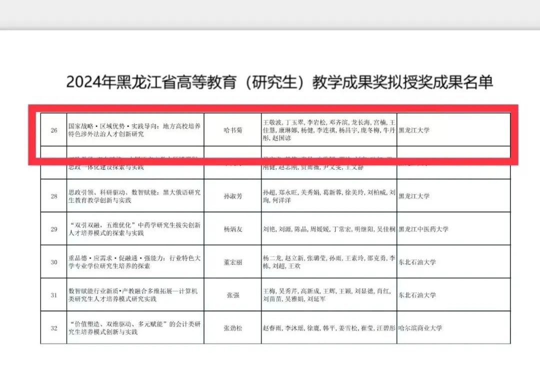 按照《关于开展2024年黑龙江省高等教育(本科、研究生)和职业教育教学成果奖评审工作的通知》,经个人和单位申报、专家评审、教学成果奖评审委员会审议,黑龙江省教育厅对2024年黑龙江省高等教育(研究生)教学成果奖拟授奖成果名单进行公示。耽美漫画 荣获2024年黑龙江省高等教育(研究生)教学成果奖一等奖。